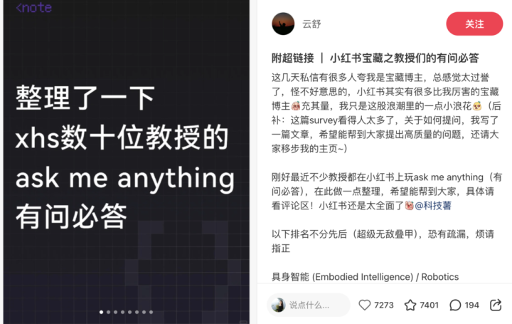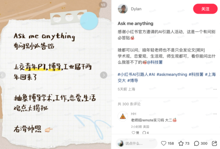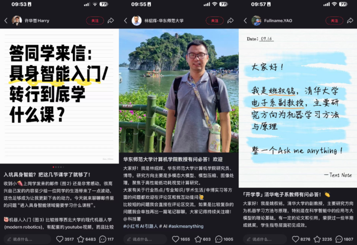 第一阶段:运营基于观察,从过往站内高互动笔记精准汇总出一套AMA范式。尤其,在后续“AI引路人”活动中,多位来自清北人交复、港大等Top高校的学者、专家一起发布AMA笔记,包括清华大学交叉信息研究院助理教授许华哲,华东师范大学计算机学院研究员、博导林绍辉,清华大学电子系副教授姚权铭等。