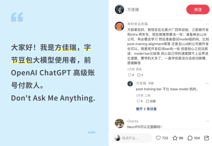 甚至,一些专业机构、互联网企业研究院负责人也闻讯而来,跳入了这场大讨论,如上海人工智能实验室领军青年科学家大模型中心负责人陈恺、腾讯混元Principal科学家,前DeepMindRL成员徐仲文、月之暗面强化学习负责人FloodSung、通义千问研究员郑楚杰均在小红书与网友Socialize。